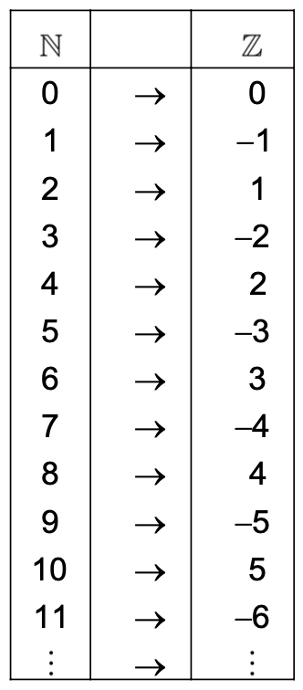 Every element in maps to exactly one element in . We therefore have that the set of integers in infinite but countable. This sometimes referred to as a countably infinite set.