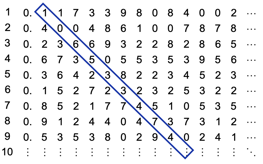 The argument looks at the digits down one diagonal and forms a new decimal by adding one to each digit. In this example, we produce the number . This value cannot be in the list because each digit must be different. However far down this countable list we go, we cannot find that number. This contradicts that this is the list of all real numbers between and .