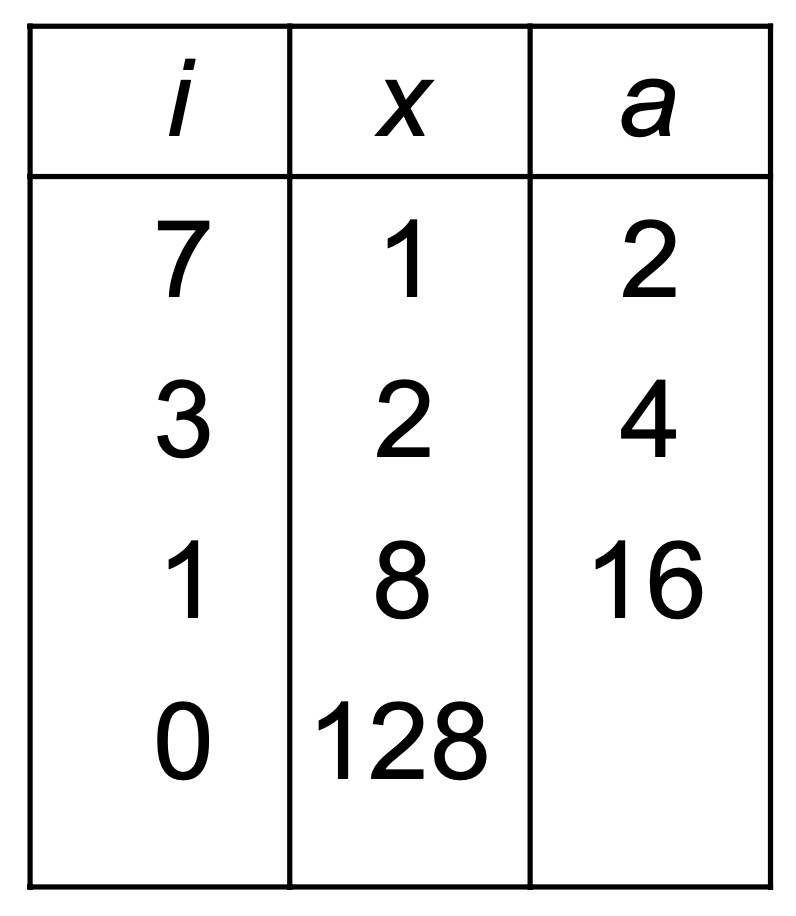 While i>0, if i is odd, replace x:=a * x, replace i:=i/2
