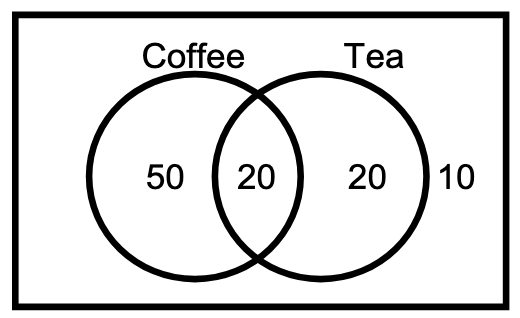 Suppose we know that 20 people drank both types of drink, and that a total of 100 people responded. Here, the simple count of 70 coffee drinkers plus 40 drinkers “double counts” the 20 people who are in both sets. The total number in at least one set is therefore .