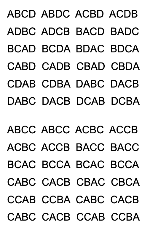 For example, compared to the old list of 24 elements, each string now appears twice, leaving only 12 permutations with the repeated character.