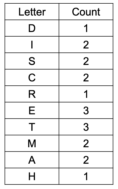 Consider the number of ways that the 19 letters can be arranged. There are clearly ways, not accounting for repeated letters. To account for this, we divide the total permutations by the repeated permutations of each letter: