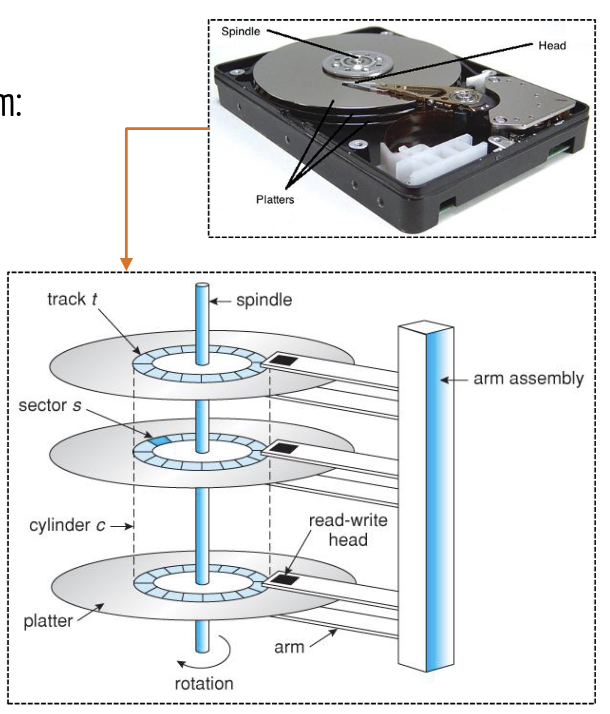 Spindle (central rod that the disks, or platters, revolve around)- physical