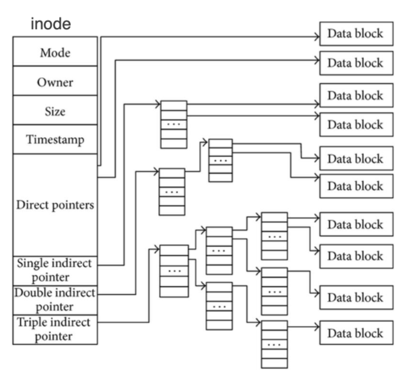 - pointers to data blocks (usually 15 pointers) - pointers to the data blocks where the file contents are stored