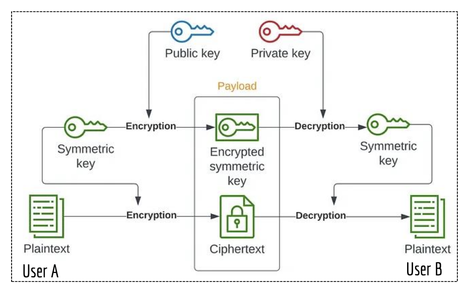 - data sec - unauthorized access, corruption or theft throughout its lifecycle to ensure the CIA of information. prevention includes encryption (methods include symmetric/asymmetric/hybrid (see image)), hashing/checksums (