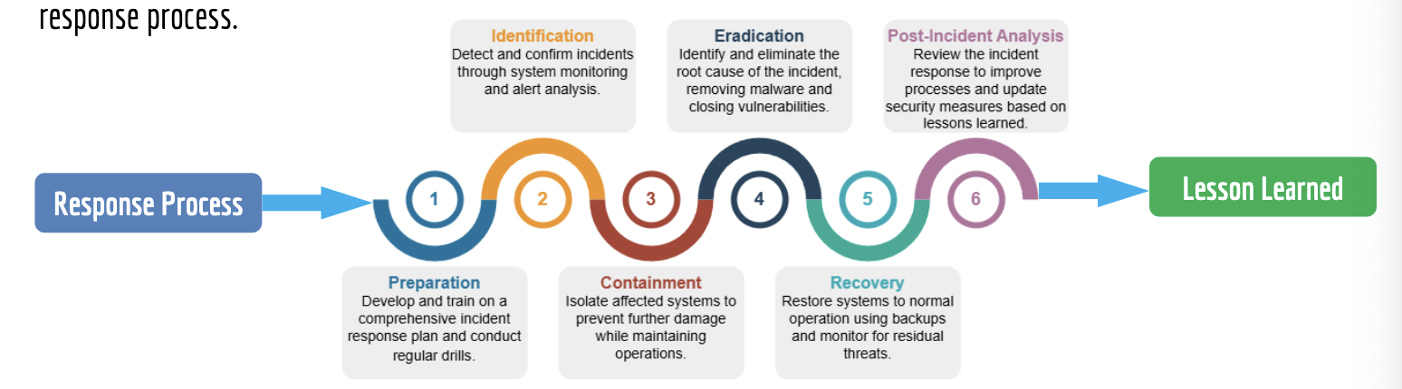 - response process outlined in response plan. response plan outlines predefined actions and procedures that an organisation should follow when responding to a security incident
